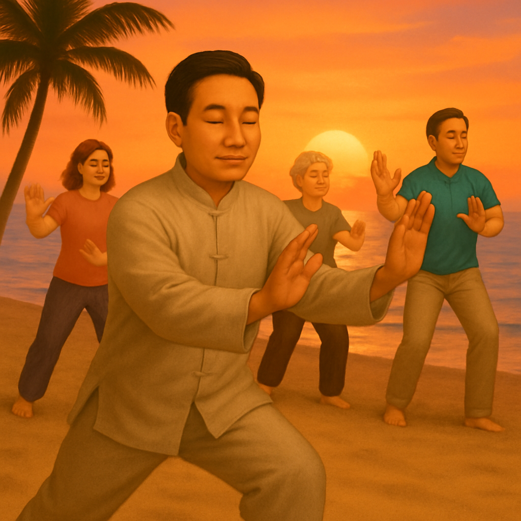 Мастер-класс «Тай чи на закате» — это спокойное и гармоничное занятие для гостей пляжного клуба, которое проводится в вечернее время, когда солнце садится за горизонт.